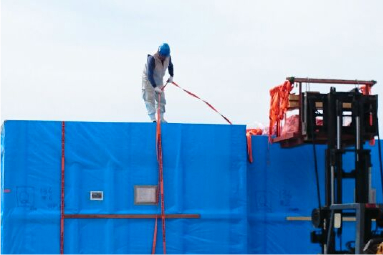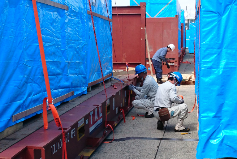 帯鉄での結束の場合、シールが開き帯鉄本来の強度以下で破断する事がありますが、キズまたはシール部不具合等の心配もなく、荷物を固定することができます。ワイヤーロープの場合は、しばしばクリップの数不足、締め付け力不足により本来の強度を活かせませんが、固定する専用バックルとの組合せにより、明確な破断強度基準を提案します。