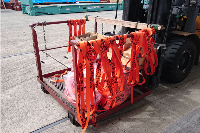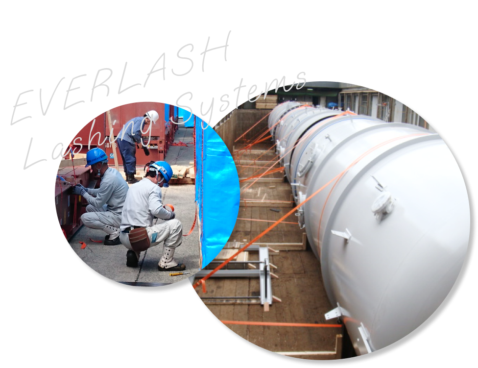 エバーラッシュは、従来の帯鉄・ワイヤーロープ・ラッシングバンドやチェーンブロック、また固定用木材にかわる高強度ポリエステル糸製ワンウェイラッシング資材を使用したラッシングシステムのことです。